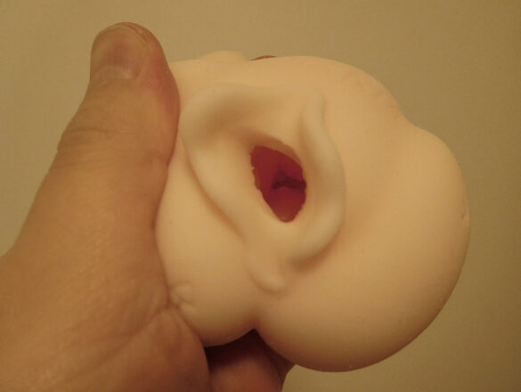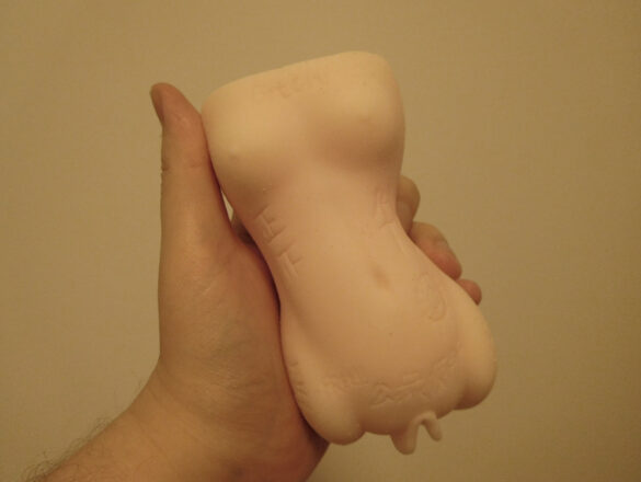 The outside of the toy has droopy vaginal lips and a pair of cute breasts with nipples. She’s shaped like the torso of a woman, with buttocks, a belly button, an hourglass-shaped body. It’s kind of creepy if you think about it!