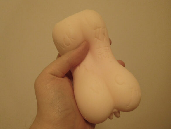 The material is TPE rubber. It’s a very flexible type of rubber that returns to its original form. It’s durable enough to endure stress. Just don’t go crazy if you don’t want wear and tear. The surface of the toy is smooth, and leaves a mild rubbery smell on any surface it touches. It’s easy to wash the smell off. The material has some visible imperfections, but these are integral to the theme: Japanese and English text litter her slutty little body. The writing is cut into the toy, like wounds. She’s painted in a flesh-like color on the outside, and a cute pink on the inside. She’s cut off and sealed where her shoulders should start. No air can escape this pussy once your dick is buried deep.
