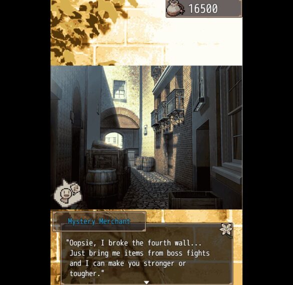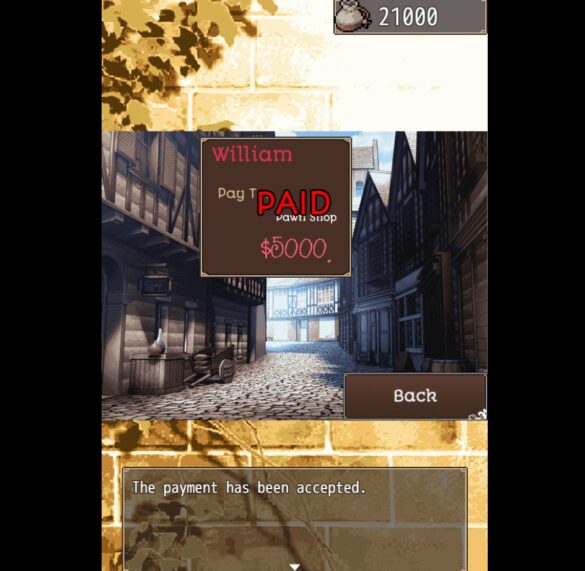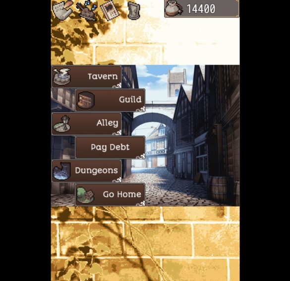 I recognized many of the sound effects in the game as royalty-free stock RPG sounds that appear in other titles. They still managed to fit their purpose and made the game more immersive. For example, choosing an option in the menu prompts a simple beep effect. Clicking the menu tabs prompts the sound of a page being flipped. Entering a place sets off a small bell, like you’ve just entered a store.