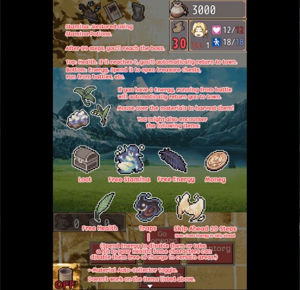 When exploring an area, click the button that says ‘Go forward’ to move. Potions can be used during exploration and battles. You gather ingredients during exploration, you collect them by touching them with the mouse cursor. Maria can synthesize potions if she has gathered enough ingredients. She can only synthesize them at her home, so stocking up is recommended.